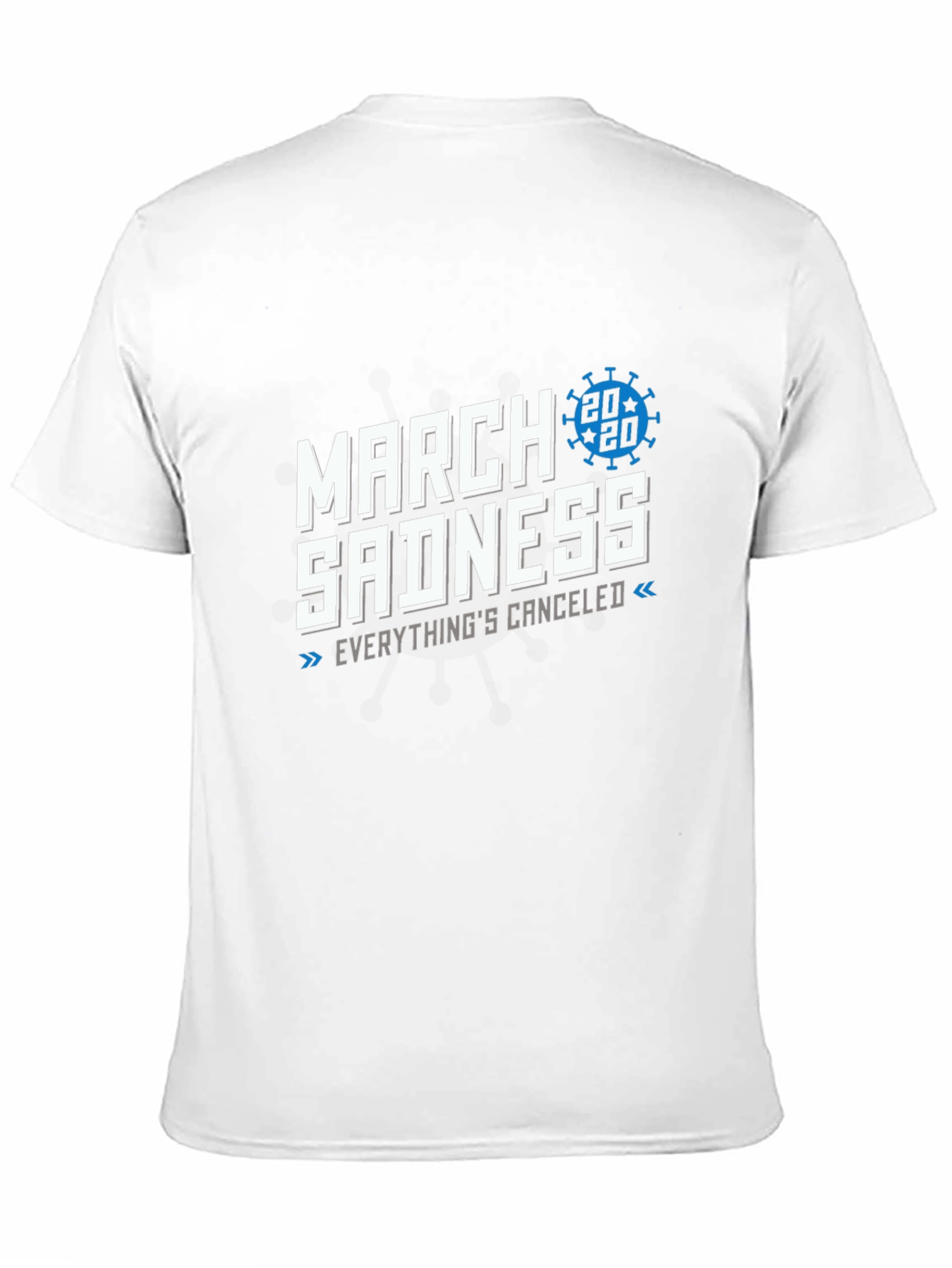 This black t-shirt features a humorous design referencing the "March Sadness" of 2020. The bold white lettering contrasts sharply against the dark background, making the message pop. The text is accompanied by a stylized graphic featuring the year 2020, likely alluding to the events that led to widespread cancellations. Made from a comfortable-looking fabric, this tee is perfect for casual wear and making a statement. Wear it to social gatherings, events, or just lounging around the house. It's a great conversation starter and a unique way to remember a truly unforgettable time. Show off your sense of humor and make a statement with this memorable t-shirt!