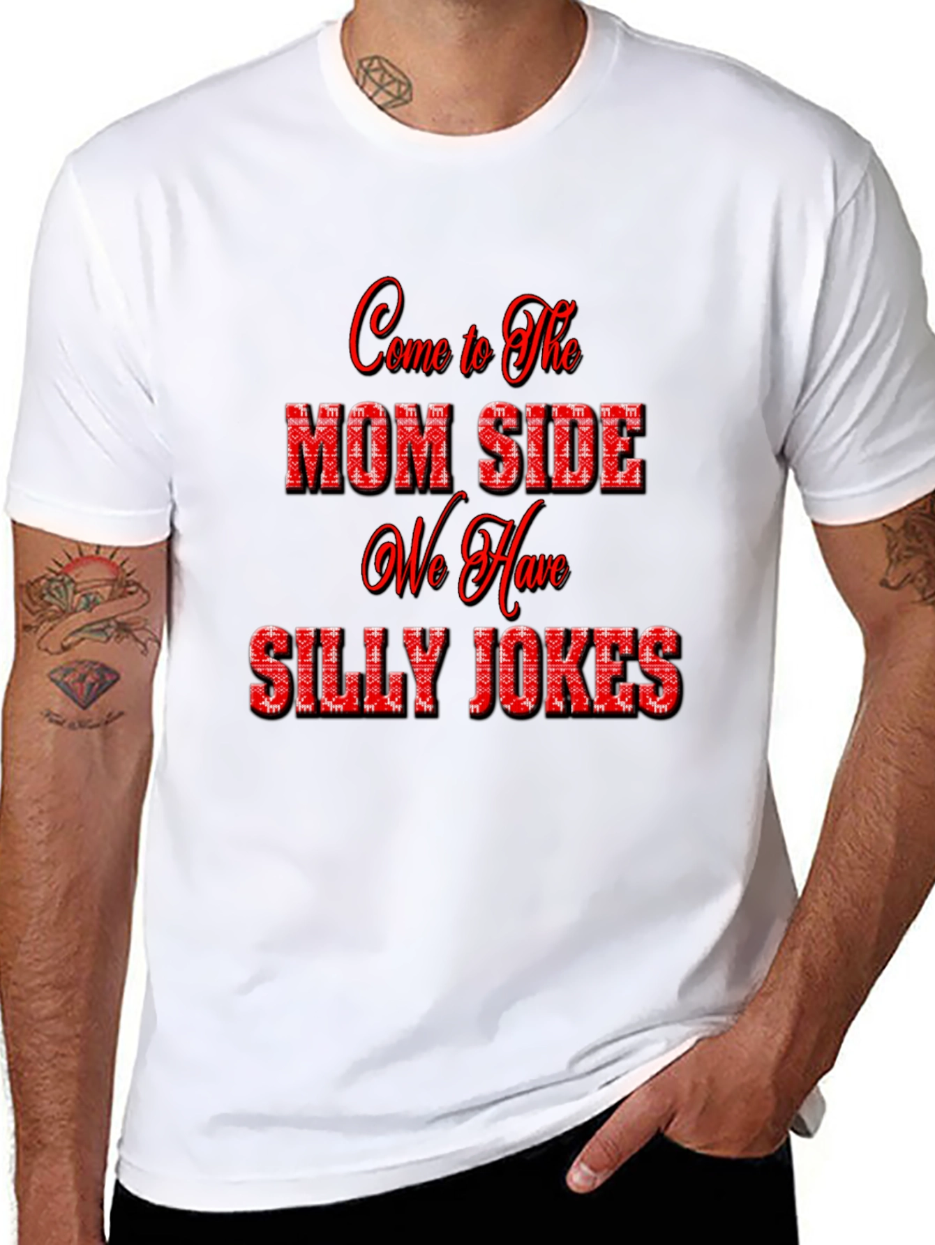 This stylish black t-shirt features a playful and humorous design that is perfect for moms with a sense of humor. The bold red lettering proudly proclaims, "Come to the MOM SIDE, We Have SILLY JOKES." The playful font adds to the lighthearted feel. It's a comfortable and casual shirt made of what appears to be soft cotton or a cotton blend. This tee would be great for everyday wear, casual outings, or as a fun gift for the mom who loves to share a good laugh. Show off your mom pride with this funny and eye-catching shirt!