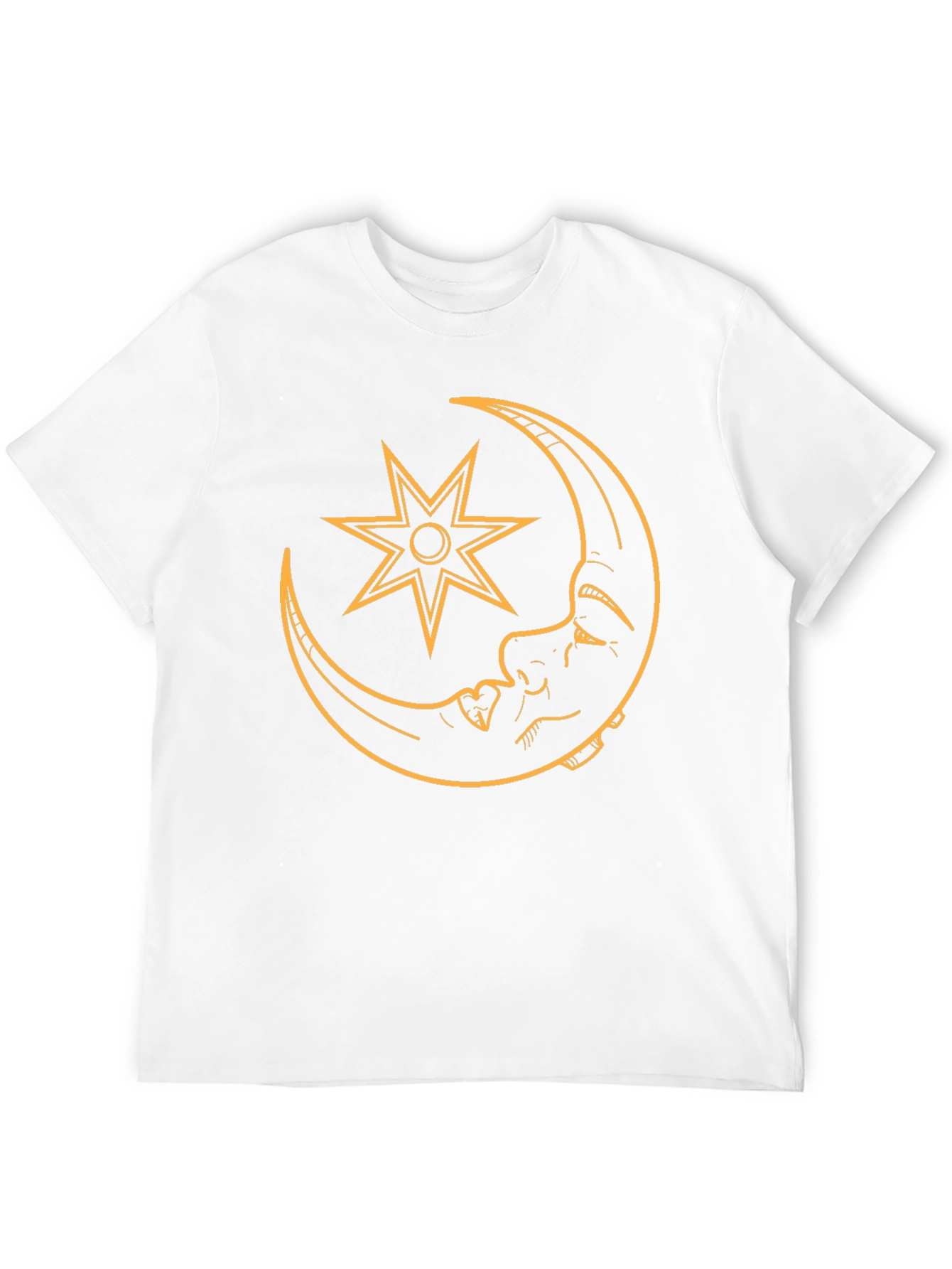 Embrace celestial style with this striking black t-shirt, featuring a unique graphic design. A crescent moon with a serene face cradles a radiant eight-pointed star, both outlined in a bold yellow hue. This eye-catching tee is made from a comfortable, lightweight fabric, perfect for everyday wear. The classic crew neck and short sleeves offer a relaxed fit, making it ideal for casual outings, lounging at home, or layering under jackets. Express your individuality and add a touch of cosmic charm to your wardrobe with this must-have graphic tee.