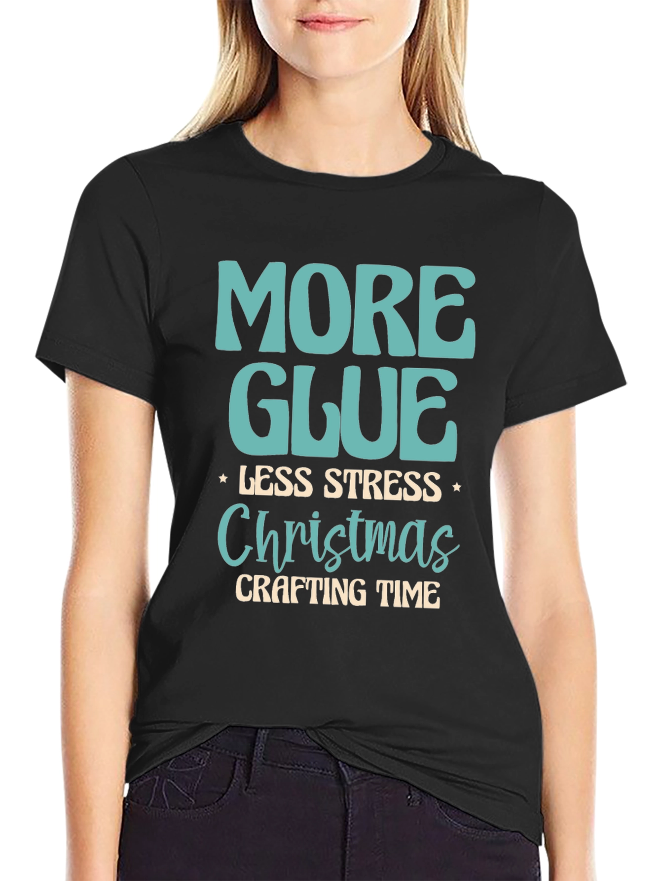 Get into the holiday spirit with this fun and festive "More Glue Less Stress Christmas Crafting Time" T-shirt! This eye-catching black tee features a playful design in turquoise and cream, perfect for crafters and DIY enthusiasts. The shirt is made from a soft, comfortable fabric, making it ideal for all-day wear during your crafting sessions or Christmas celebrations. Show off your love for crafting and spread some holiday cheer with this unique T-shirt. It's a great conversation starter and a perfect gift for the crafty person in your life. Wear it while making decorations, wrapping gifts, or attending holiday parties. Add a touch of humor and creativity to your wardrobe with this must-have Christmas crafting tee!