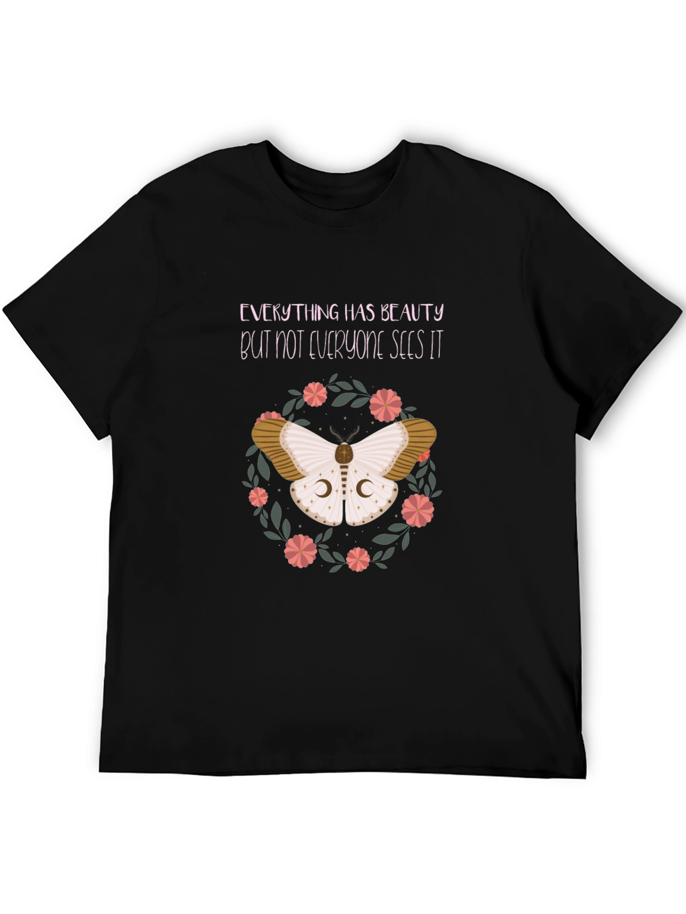 This stylish black t-shirt features a unique and inspiring design. At the center is an elegant moth, surrounded by a delicate wreath of flowers and leaves. The text "Everything has beauty but not everyone sees it" adds a touch of positivity. This comfortable tee is perfect for everyday wear. The design is eye-catching and sure to spark conversations. It is a great way to express your unique style and love for nature. Great for casual outings, or as a thoughtful gift for someone special. The classic fit is flattering and easy to style. It would pair well with jeans, shorts, or a skirt.