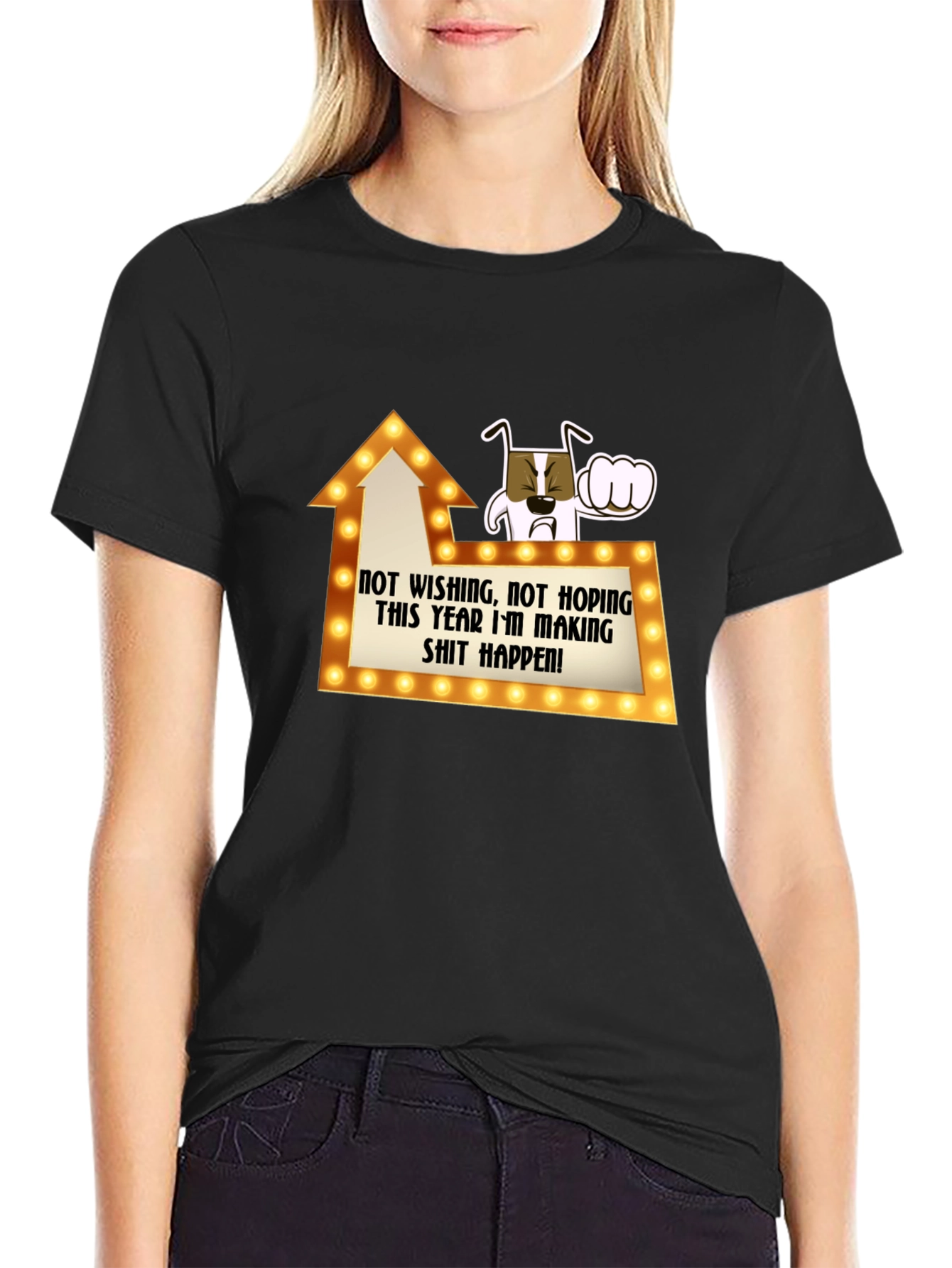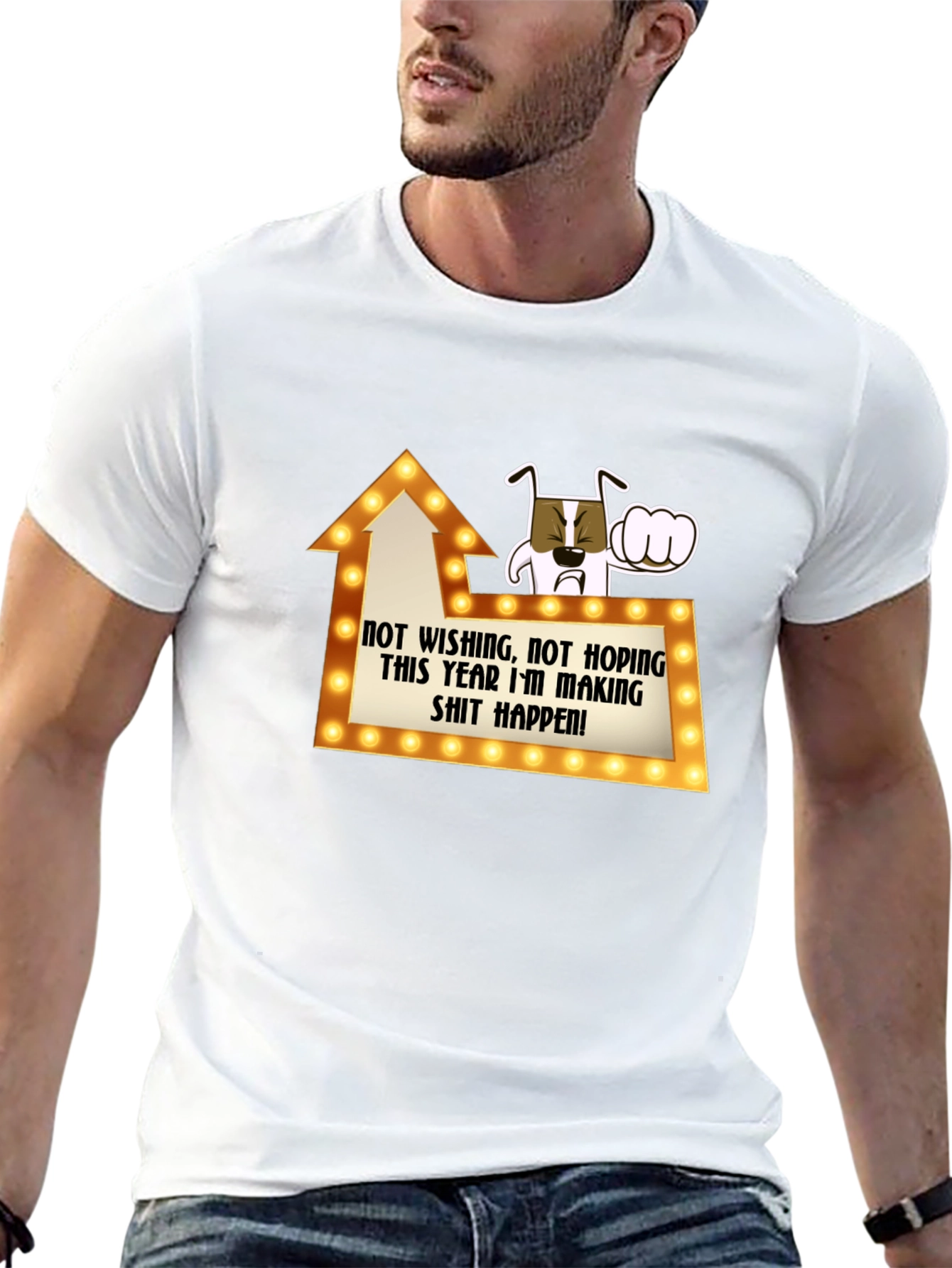 Show your determination with this bold, black t-shirt. It features a vibrant graphic design with an arrow light box displaying the motivational phrase: "Not Wishing, Not Hoping This Year I'm Making Shit Happen!" The design also includes a cartoon dog giving a fist pump of encouragement. Made from comfortable-looking fabric, this tee is ideal for casual wear, gym sessions, or as a statement piece. It is a great way to display your determination and inspire those around you. Stand out and get motivated to achieve all your goals!
