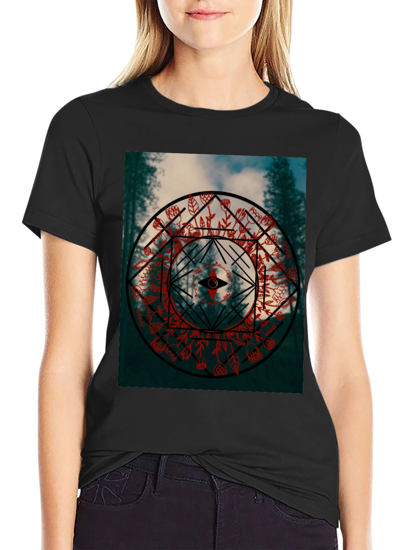 Embrace your connection with nature with this striking black t-shirt. The design features an intricate circular pattern with a central eye, all set against a lush forest backdrop. Red floral accents add a pop of color and a touch of mystique. Perfect for casual wear, outdoor adventures, or making a statement. Comfortable and stylish, this tee is a must-have for those who appreciate unique, nature-inspired fashion.