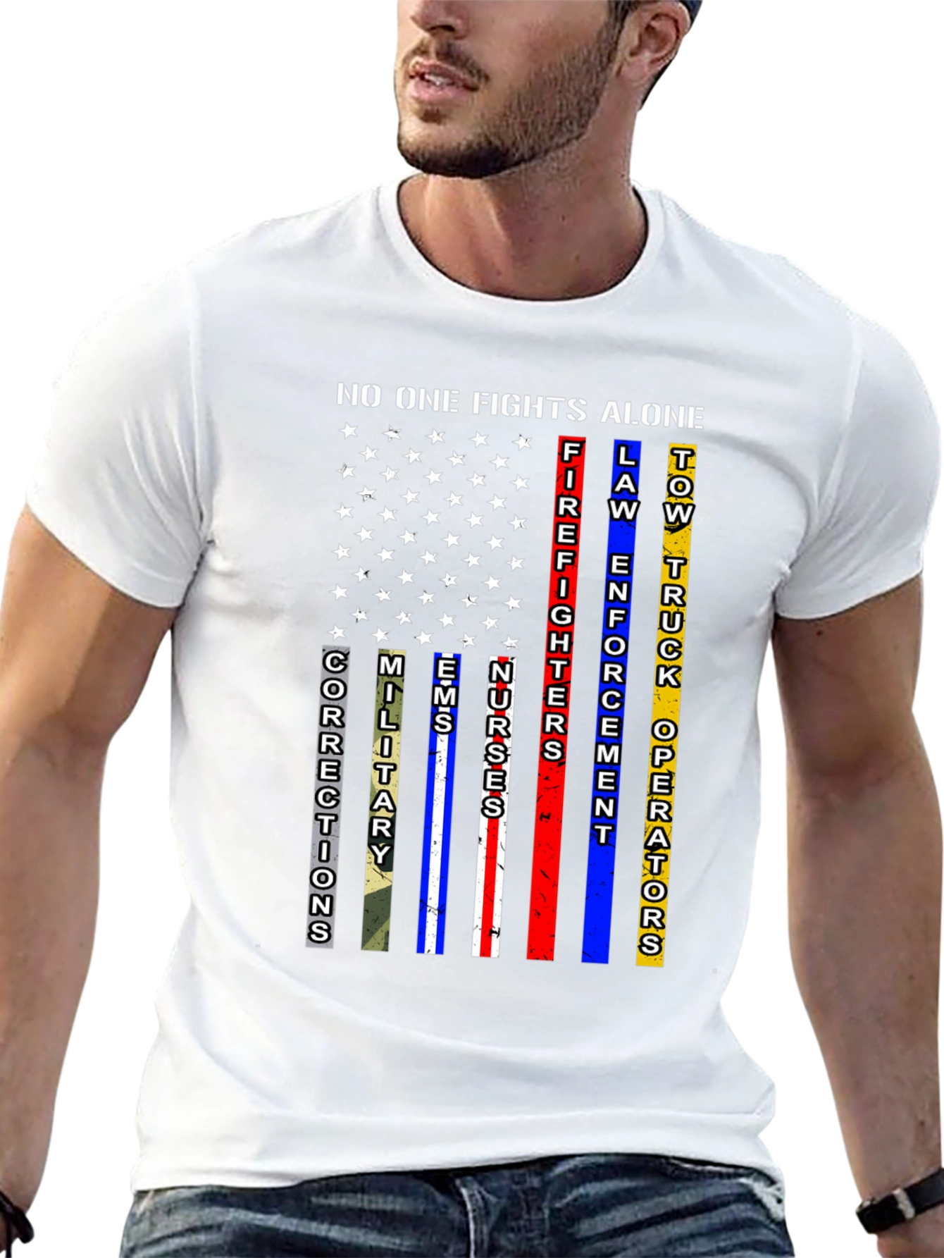 Show your support with this striking black t-shirt featuring a unique flag design! The shirt displays "NO ONE FIGHTS ALONE" above a stylized American flag. Instead of traditional stripes, it showcases dedicated bars representing different professions such as Firefighters, Law Enforcement, Nurses, Military, Corrections, and Tow Truck Operators. This bold statement piece is perfect for everyday wear to demonstrate solidarity and appreciation for those who serve our communities. Made with a comfortable fabric blend, this tee is both stylish and meaningful. Ideal for rallies, casual outings, or as a thoughtful gift.