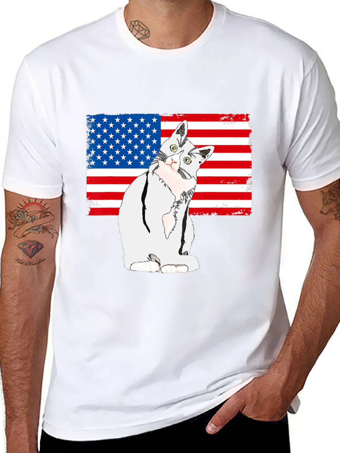 Show your love for cats and country with this unique graphic t-shirt! The black tee features a stylized image of a white and grey cat superimposed over a distressed American flag backdrop. The design offers a playful patriotic statement. Made from a comfortable-looking cotton blend, this tee is perfect for casual wear, Independence Day celebrations, or as a fun gift for cat lovers and patriotic individuals. Durable and eye-catching, this shirt is bound to become a favorite in your wardrobe.