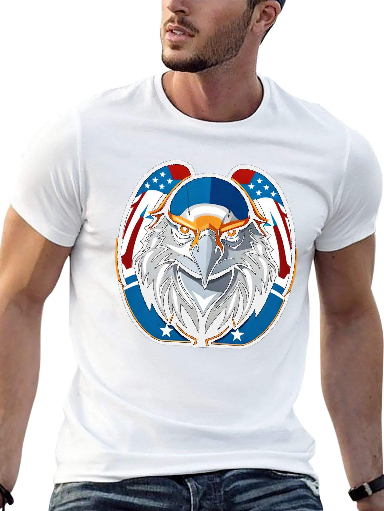 Show your American pride with this bold graphic tee. The shirt features a striking eagle design, complete with American flag-inspired accents. The eagle's head is prominently displayed with sharp eyes and an intense gaze, framed by a blue and white ring. The upper part of the eagle is adorned with the American flag, creating a visually appealing and patriotic statement. Made from a comfortable fabric, this tee is perfect for casual wear, 4th of July celebrations, or everyday wear to show your love for America.