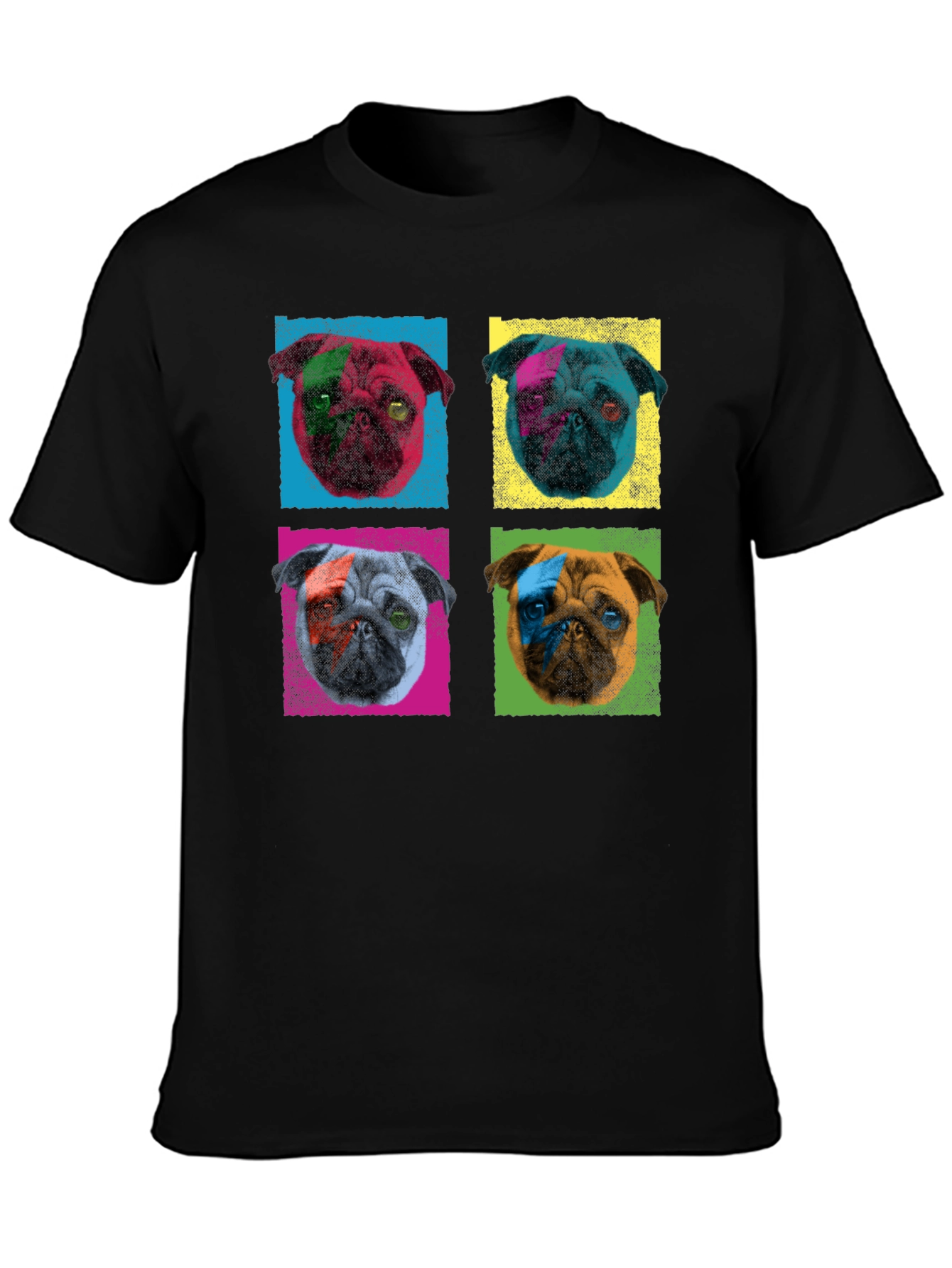 Show off your love for pugs with this unique pop art graphic tee! This black men's t-shirt features a vibrant and eye-catching design of four different pug portraits in a colorful, Warhol-esque style. The graphic is printed on a soft and comfortable fabric, perfect for everyday wear. This shirt is sure to make a statement and is ideal for casual outings, dog park visits, or simply expressing your individuality. Get ready to turn heads with this fun and fashionable pug tee!