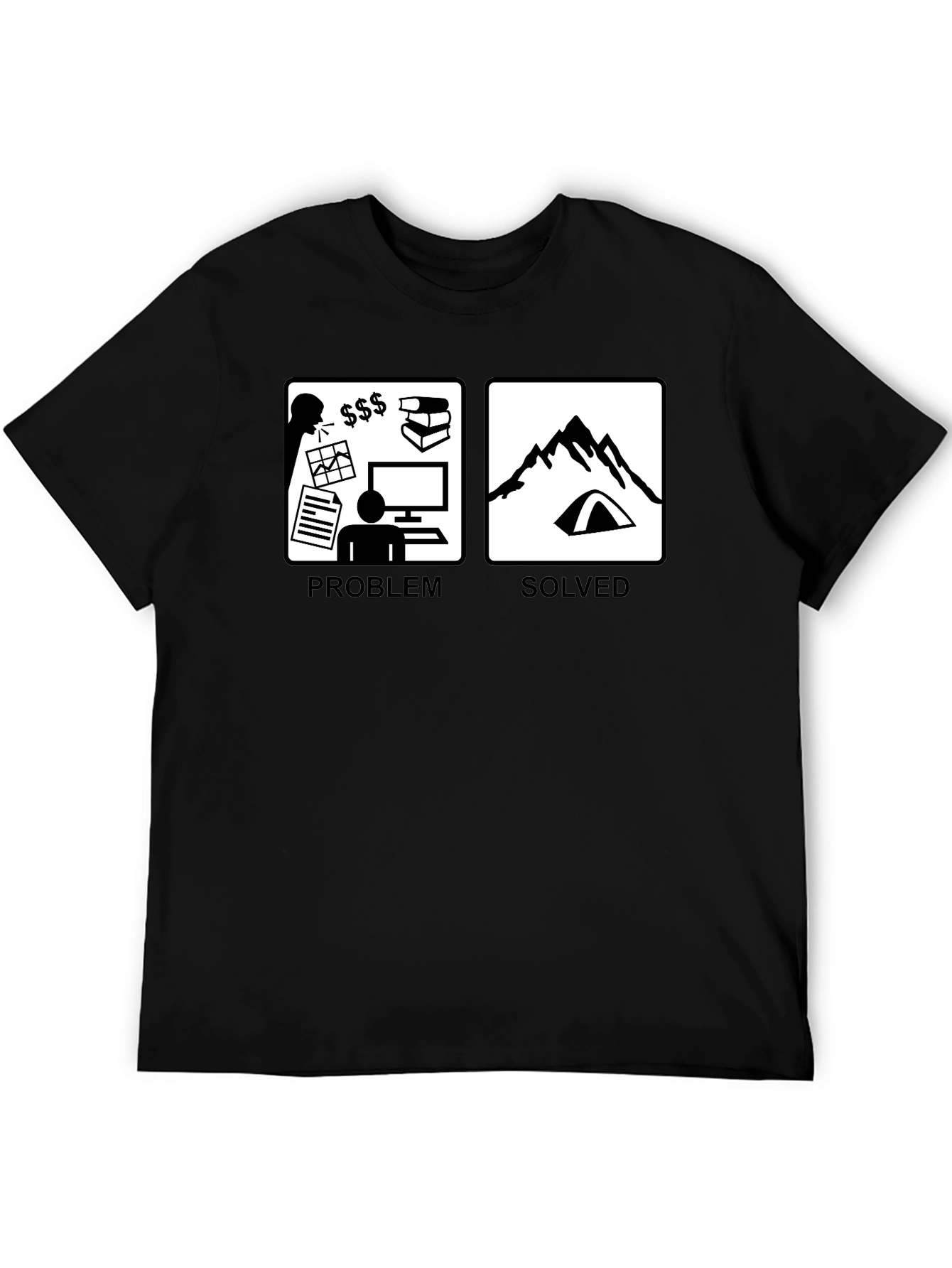 This black t-shirt features a clever graphic design contrasting work-related problems with the solution: camping. On the left, a square depicts a frustrated figure surrounded by charts, money symbols, books, and a computer, labeled "PROBLEM". The right square shows a peaceful mountain scene with a tent, labeled "SOLVED". This tee is perfect for outdoor enthusiasts with a sense of humor. Made from comfortable fabric, it's ideal for casual wear, camping trips, or as a gift for the camper who needs a break from the daily grind. Express your love for the great outdoors with this unique tee!