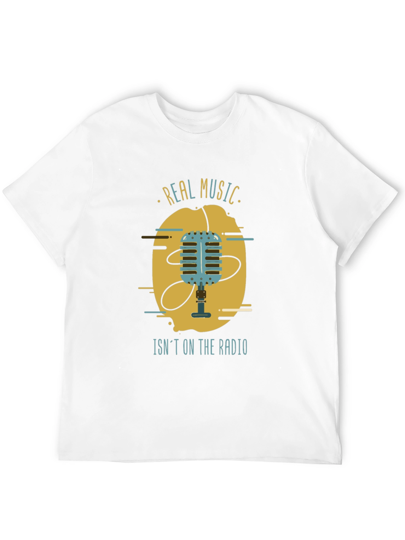 Show off your musical taste with this stylish black t-shirt. The design features a vintage-style microphone graphic, complete with the phrase "Real Music Isn't On The Radio." The shirt appears to be made from comfortable cotton, perfect for everyday wear. Ideal for music lovers, concert-goers, or anyone who appreciates authentic sound. This tee is sure to be a conversation starter. It is designed for a comfortable fit, making it a must-have addition to your wardrobe. Perfect for casual outings, band practice, or lounging around the house. Order yours today and let your passion for real music shine through!