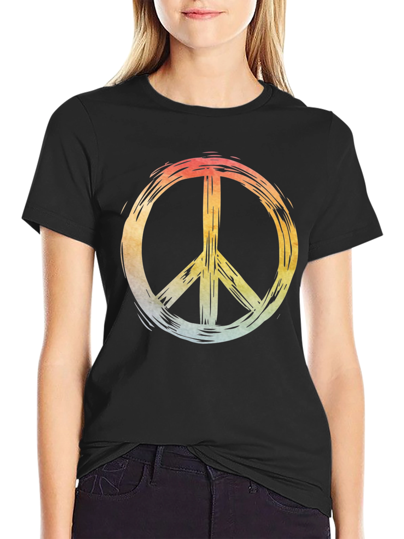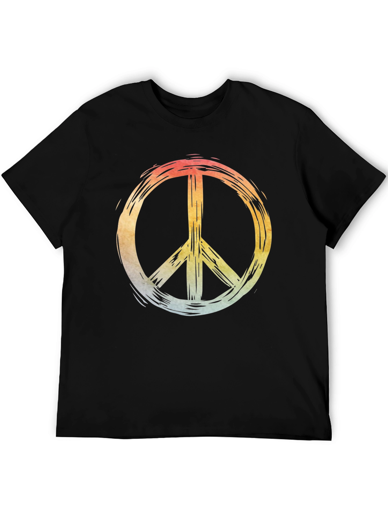 Embrace a vintage vibe with this black t-shirt featuring a vibrant peace sign graphic. The design showcases a colorful, distressed effect that adds a touch of retro charm. Crafted from comfortable cotton material, this tee offers a relaxed fit for all-day wear. The striking graphic makes it a standout piece perfect for casual outings, music festivals, or everyday style. Pair it with jeans or shorts for a cool and effortless look. Show your love for peace and style with this unique statement t-shirt.
