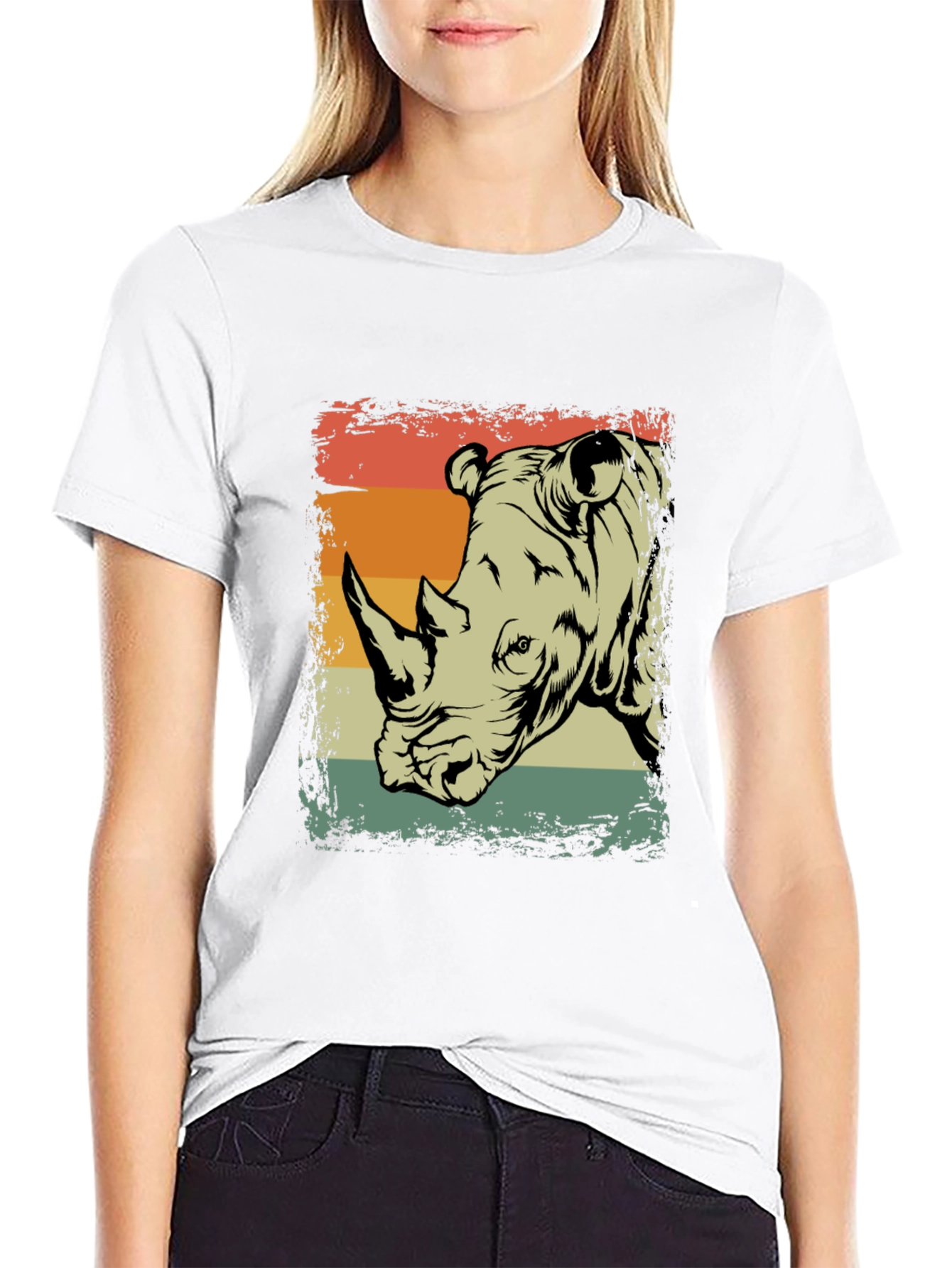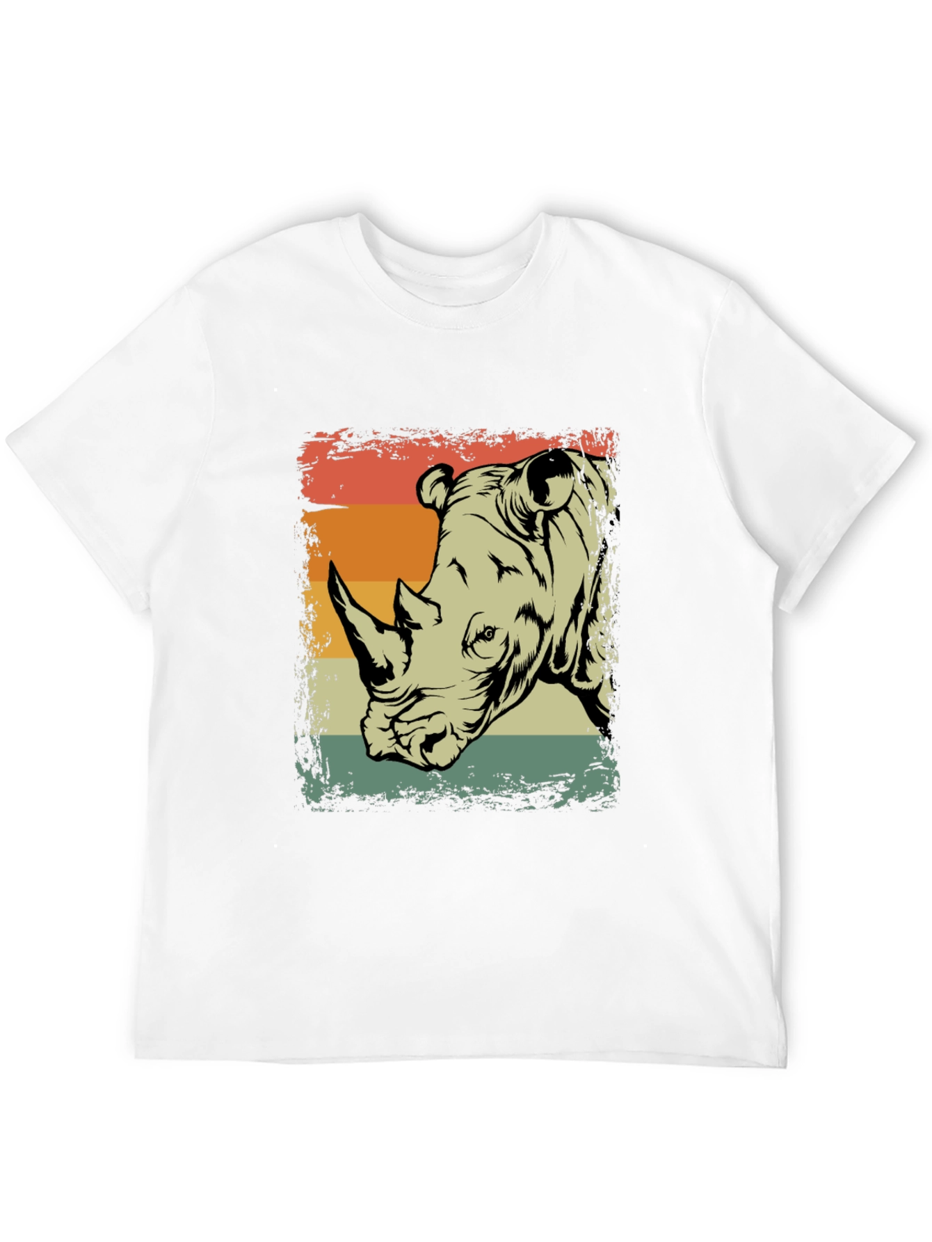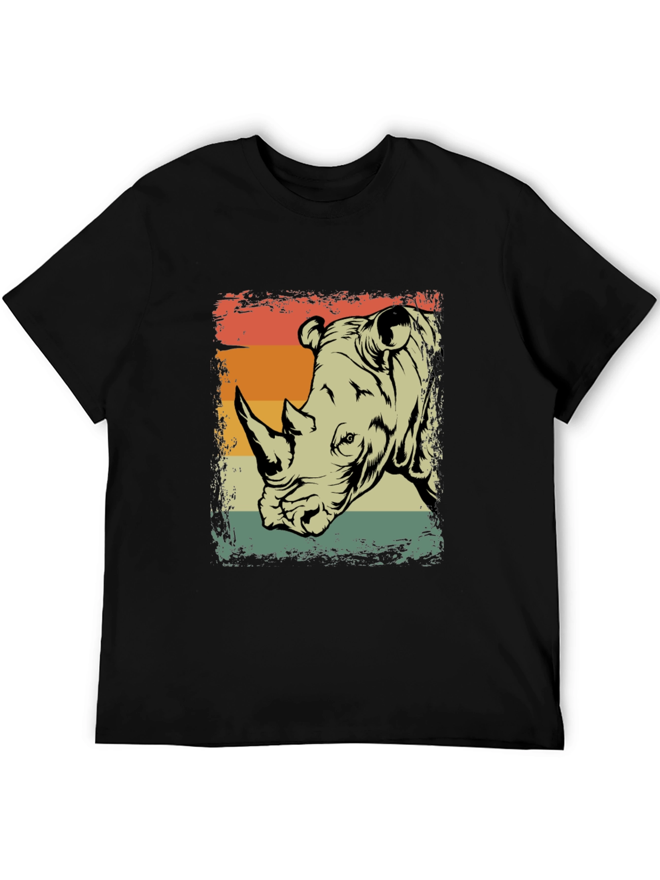 Show off your love for wildlife with this cool retro rhino t-shirt. Made from a comfortable material, this black short-sleeve tee features a unique graphic print of a rhino head set against a vintage-style orange, beige, and green striped background. The distressed design adds a touch of ruggedness, making it a great choice for casual wear. Perfect for animal lovers and anyone who appreciates a classic, laid-back style. Pair it with jeans or shorts for an effortlessly cool look.