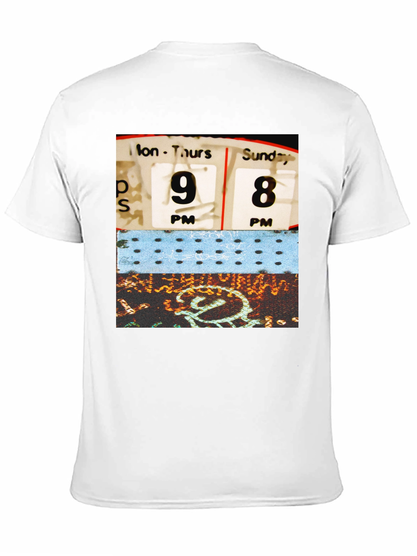 Show off your unique style with this vintage-inspired black t-shirt. The shirt features a striking graphic print with a retro vibe. It showcases a collage with a time schedule and some other retro style designs. Perfect for casual outings, concerts, or adding a touch of nostalgia to your everyday wardrobe. This t-shirt is a comfortable and stylish choice for anyone who appreciates classic graphic designs and wants to make a statement.