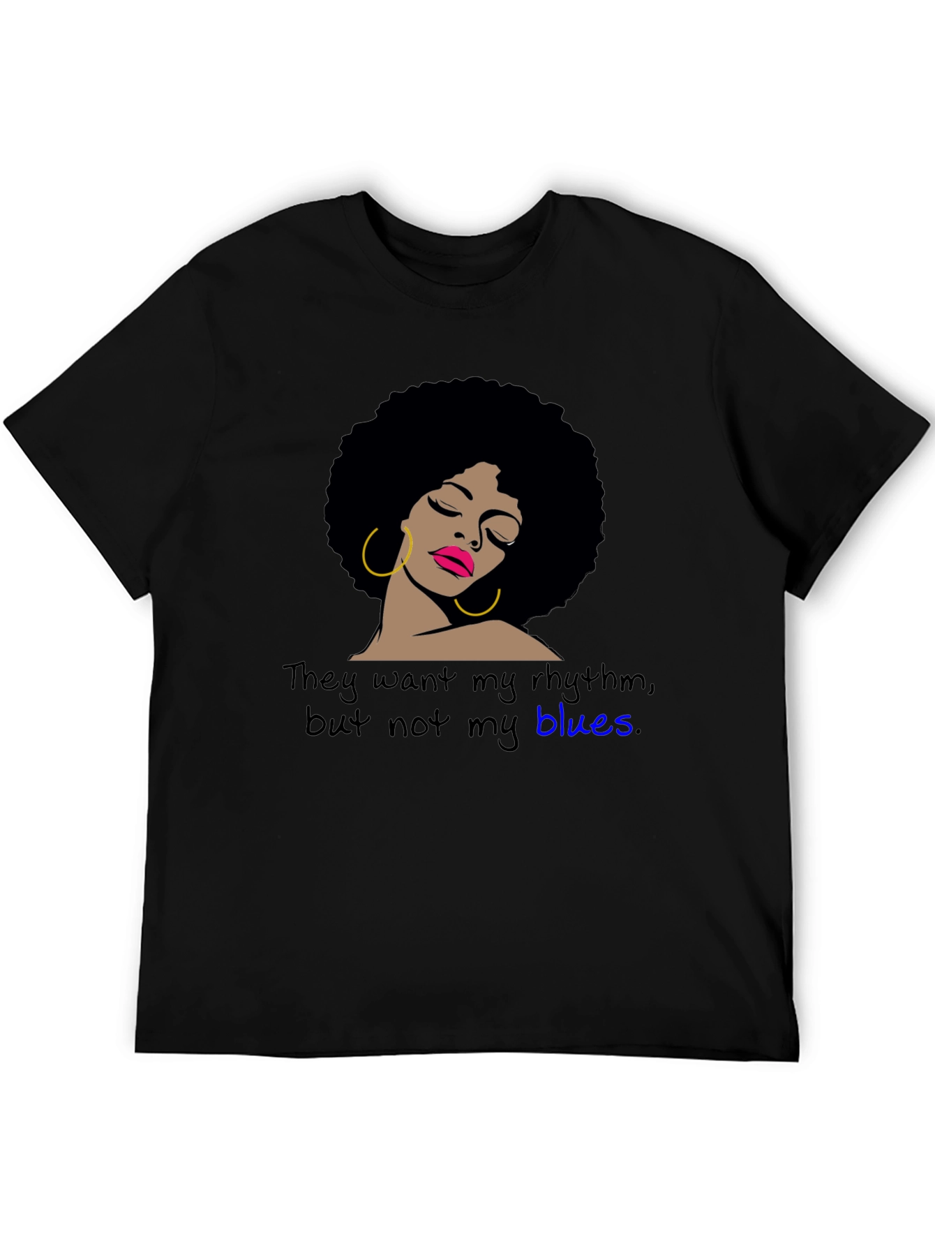 This stylish black t-shirt features a stunning graphic of a woman with a large afro and gold hoop earrings. The design also includes the phrase "They want my rhythm, but not my blues," with the word "blues" highlighted in blue. Made from a comfortable fabric, this tee is perfect for everyday wear. The t-shirt's message and unique design make it a standout piece for expressing individuality. Wear it casually with jeans, or dress it up with a jacket for a night out. This shirt is sure to turn heads and spark conversations.
