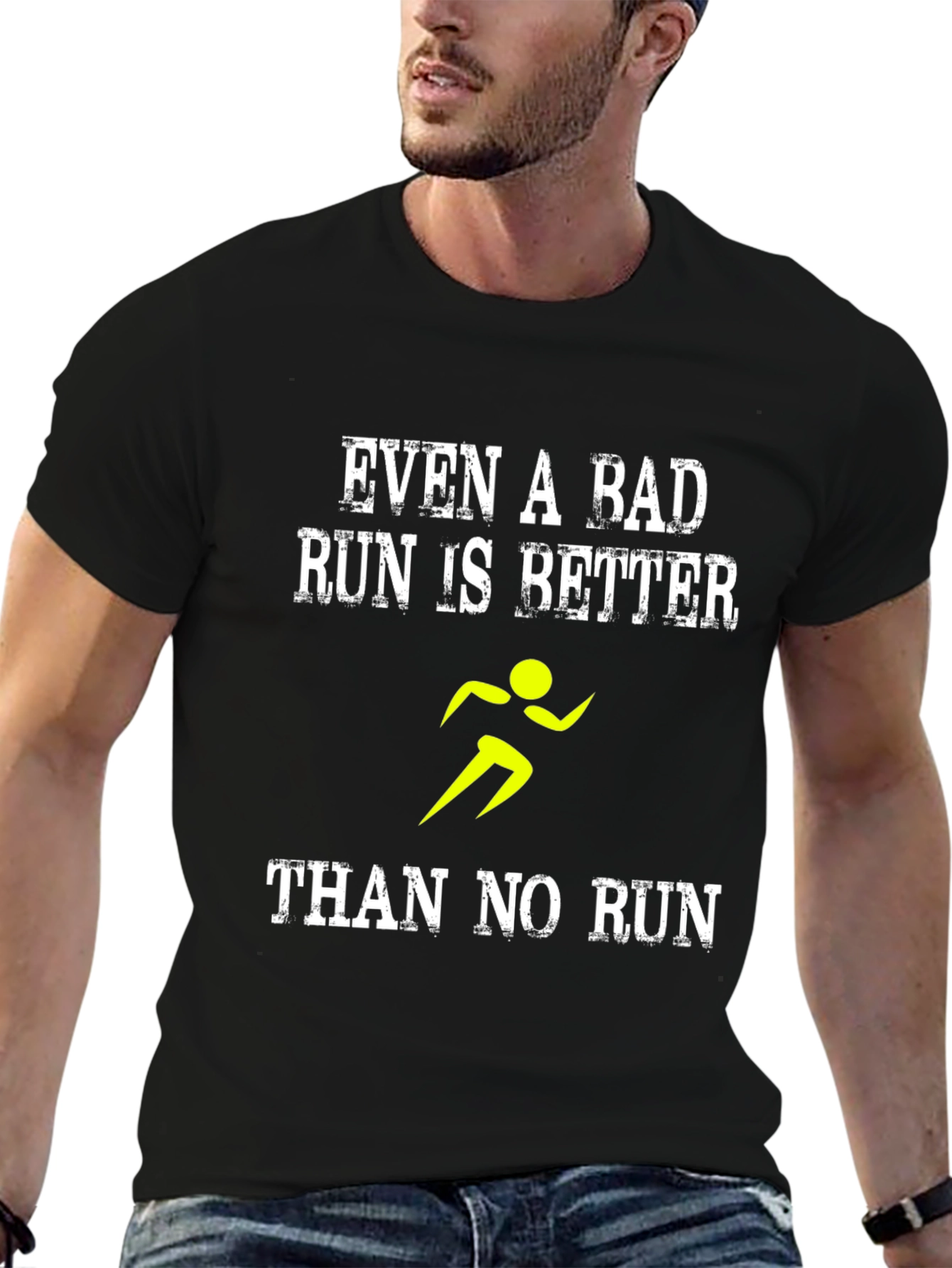 Show your love for running with this stylish black t-shirt. Featuring a distressed white font that reads 'EVEN A BAD RUN IS BETTER THAN NO RUN' above and below a yellow runner graphic, this shirt is perfect for everyday wear or workouts. Made from comfortable, breathable fabric, it is suitable for any activity level. Wear it to the gym, on your next run, or just around town to show your passion for fitness. Makes a great gift for runners!
