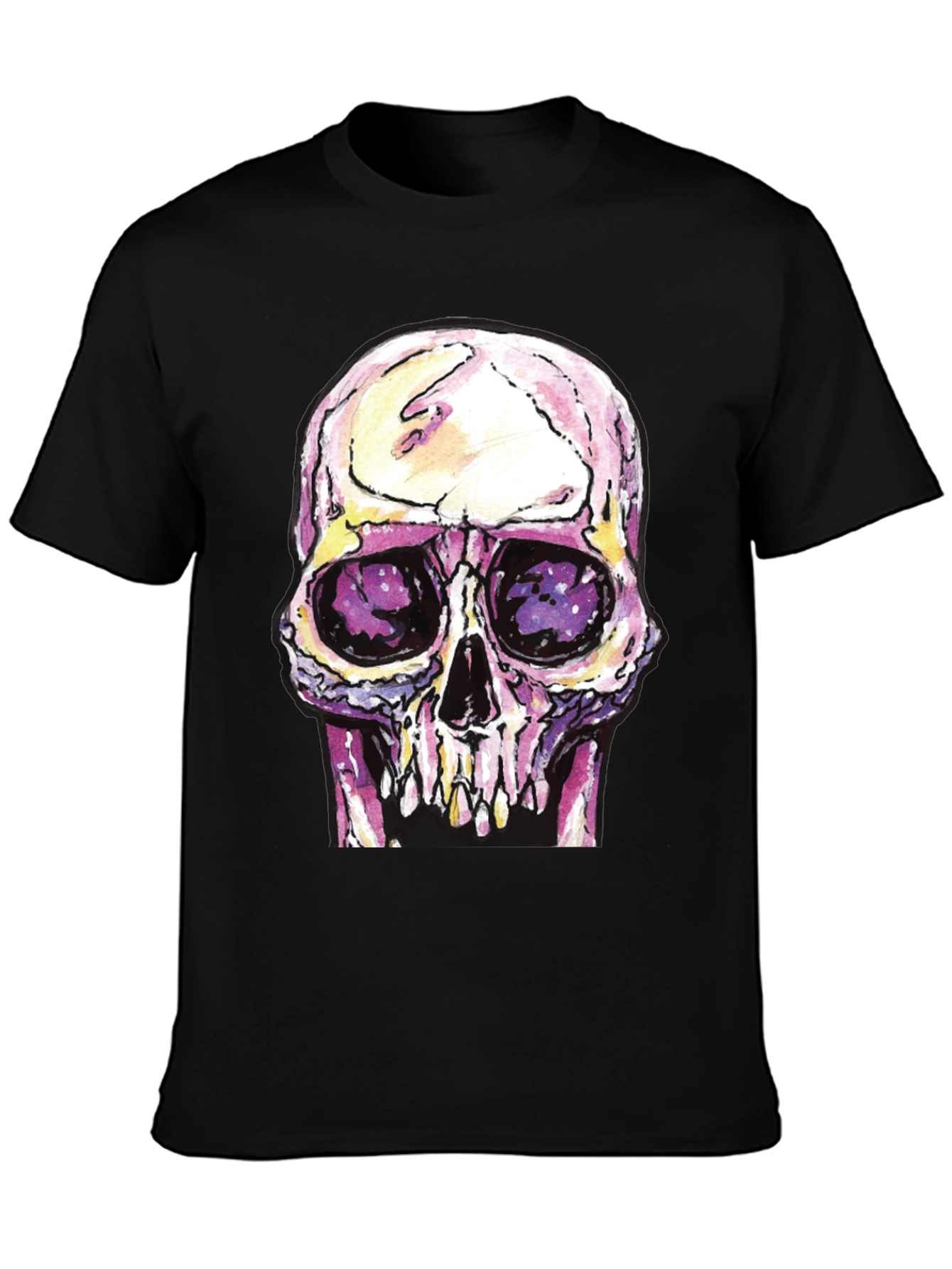 Make a bold statement with this striking black t-shirt featuring a vibrant, artistic skull graphic. The design boasts a colorful, almost watercolor-like rendering of a skull with deep purple eye sockets, lending an edgy and eye-catching look. Crafted from a soft, comfortable fabric, this tee is perfect for casual wear, concerts, or expressing your unique style. Pair it with jeans or shorts for an effortlessly cool outfit. Stand out from the crowd with this must-have graphic tee, a perfect blend of comfort and distinct fashion. Get yours today and add a touch of the macabre to your wardrobe.