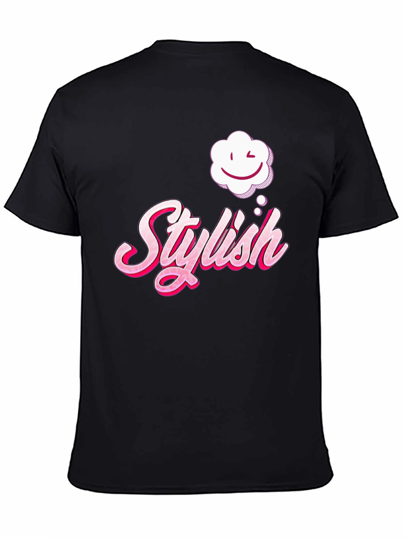 Make a statement with this stylish black t-shirt featuring a unique graphic design. The eye-catching print includes the word "Stylish" in a vibrant pink, complemented by a playful cloud with a winking smiley face. Perfect for casual wear, this tee offers both comfort and a touch of personality. Its dark color ensures versatility, pairing well with jeans, shorts, or skirts. Ideal for anyone looking to add a fun and trendy piece to their wardrobe, this t-shirt is sure to turn heads and spark conversations. Grab yours today and showcase your impeccable taste!