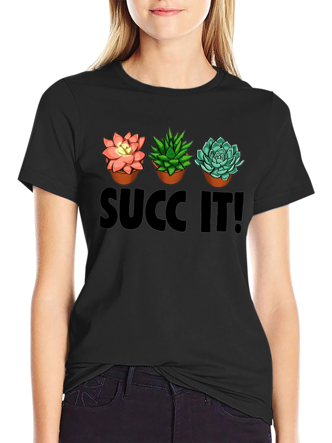 Show off your love for plants with this fun graphic tee! This black t-shirt features a trio of potted succulent illustrations in a row above the humorous text "Succ It!" The design is bold and eye-catching, perfect for casual wear. The t-shirt appears to be made from a soft, comfortable fabric, ideal for everyday use. Wear it to your next gardening club meeting, out with friends, or just relaxing at home. This tee is a great way to express your personality and add a touch of humor to your wardrobe. It's a conversation starter and sure to bring a smile to those who see it.