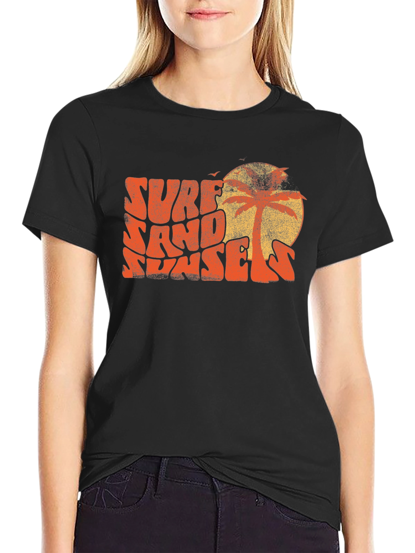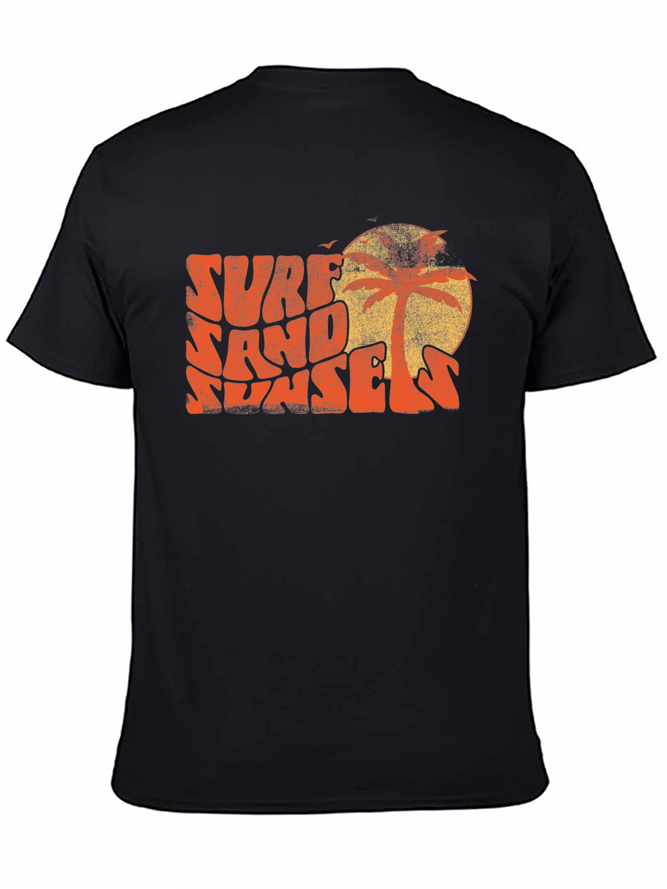 Capture the vintage vibes with this Surf Sand Sunsets tee. Featuring a retro-inspired graphic with a sunset and palm tree design, this tee brings a nostalgic touch to your wardrobe. The faded print adds to the authentic vintage feel, while the black background makes the design pop. Perfect for casual outings, beach trips, or simply lounging around, this versatile tee is a stylish way to showcase your love for surf culture and laid-back aesthetics. Made with soft and breathable fabric, it ensures all-day comfort. Pair it with your favorite jeans or shorts for a cool and effortless look.
