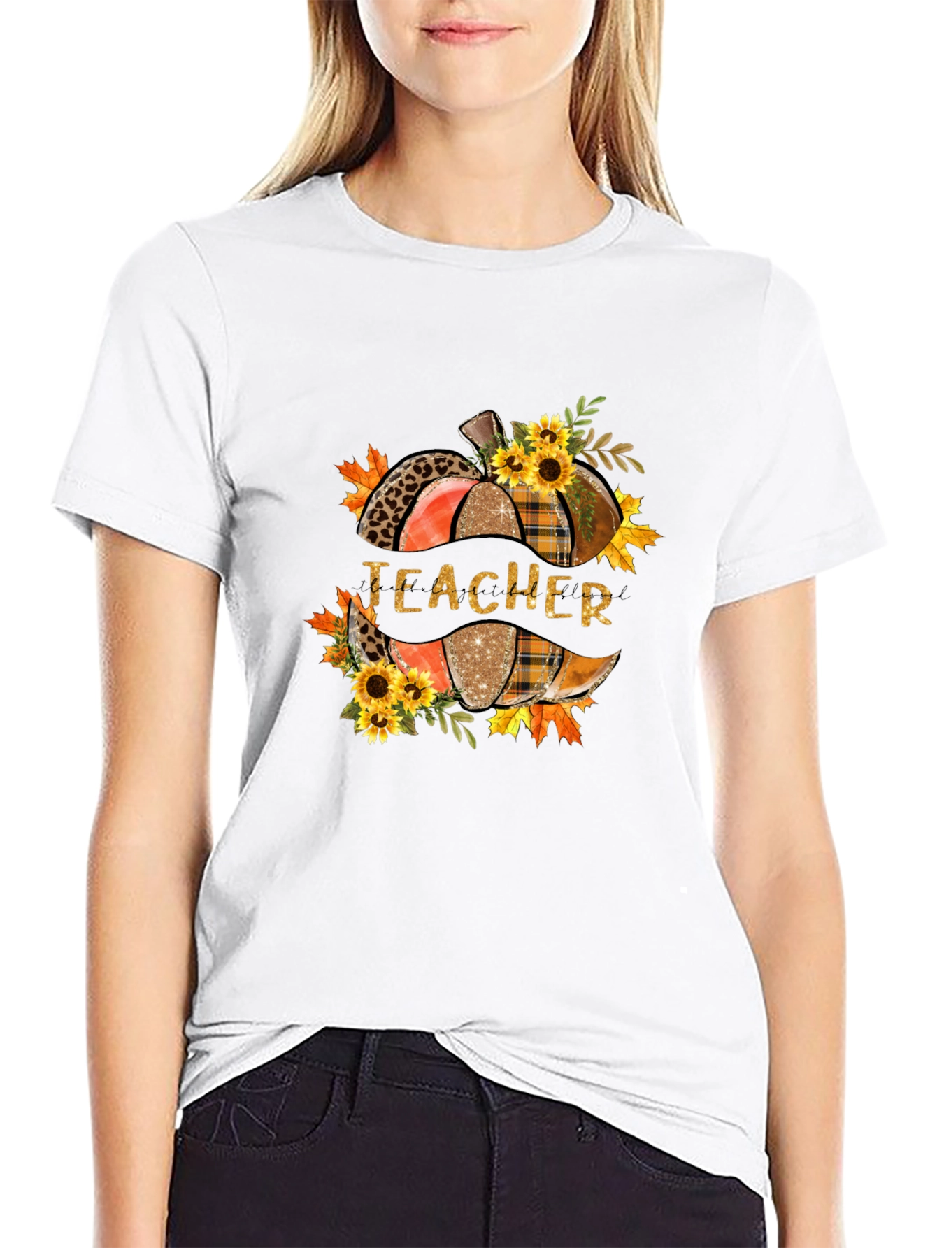 This stylish black t-shirt features a unique and eye-catching design perfect for teachers during the fall season. The central graphic showcases a decorative pumpkin composed of various patterns, including leopard print, plaid, and glitter, adorned with sunflowers and autumn leaves. The word "TEACHER" is prominently displayed across the pumpkin. Made from comfortable material, this shirt is ideal for casual wear, classroom settings, or fall-themed events. It's a fashionable and festive way for educators to express their personality and celebrate the season.
